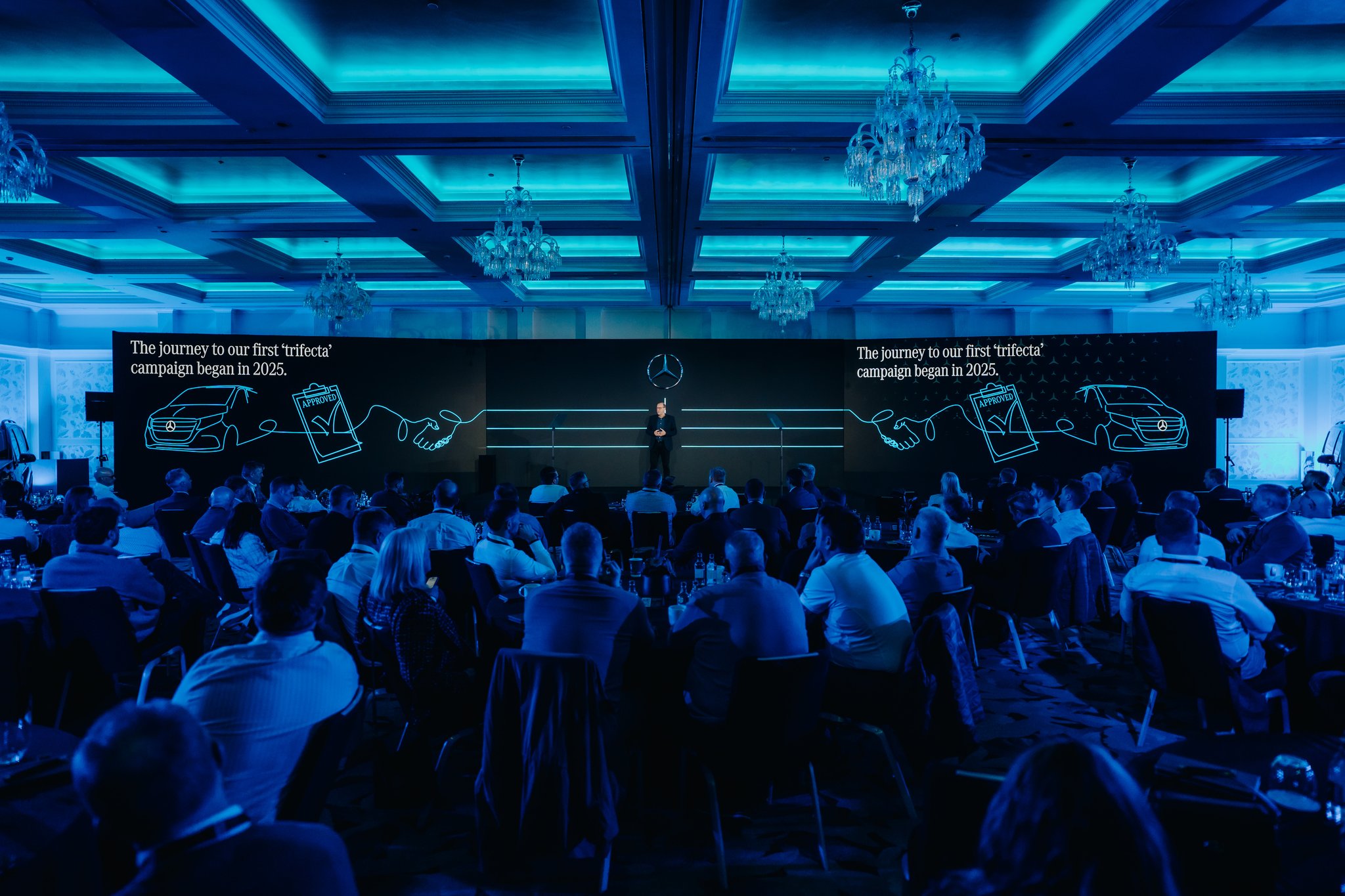 Hosted in the hotel’s elegant ballroom, the Investors’ Conference featured a bespoke stage build, high-impact graphics and seamless production management. Our team led comprehensive pre-event planning and on-site operations, ensuring flawless transitions, precise timing and an engaging environment that reflected the innovation and excellence of the Mercedes-Benz brand.